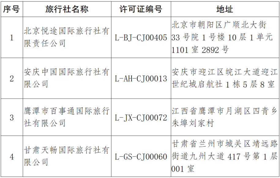 根据《旅行社条例》和《中国公民出国旅游管理办法》,自2026年4月10日起,取消以下4家旅行社经营出境旅游业务: