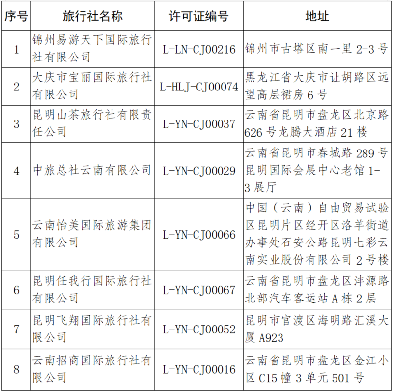 根据《旅行社条例》和《中国公民出国旅游管理办法》,自2026年4月10日起,注销以下8家旅行社业务经营许可证: